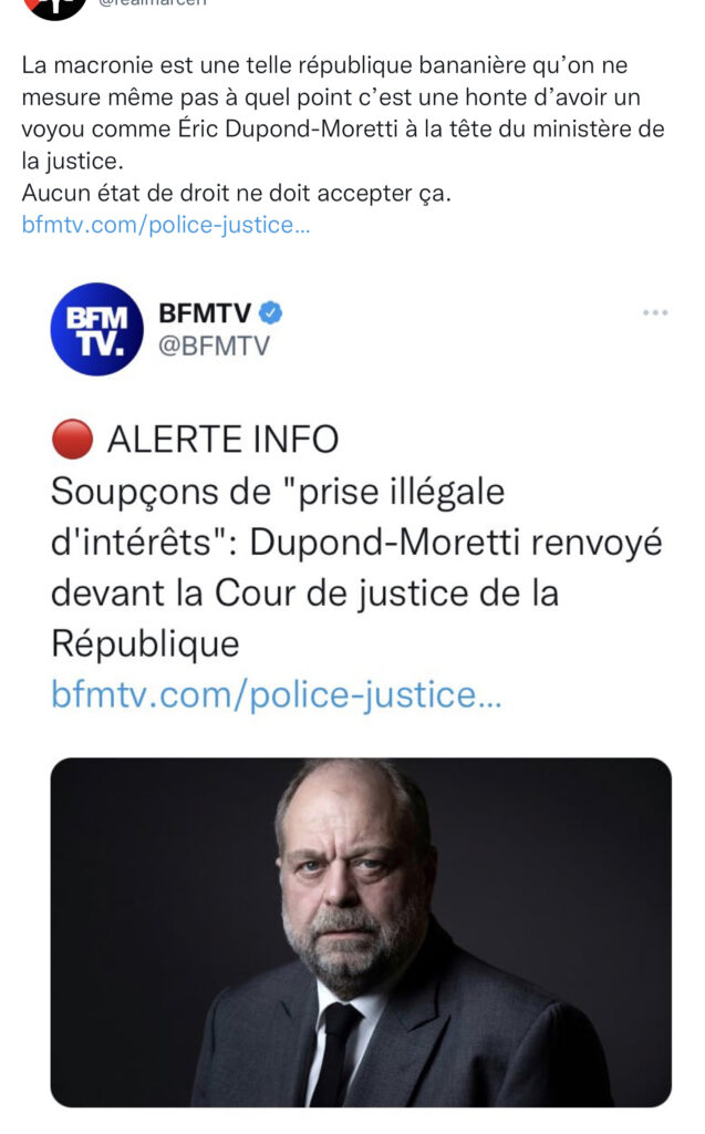 La macronie est une telle république bananière qu’on ne mesure même pas à quel point c’est une honte d’avoir un voyou comme Éric Dupond-Moretti à la tête du ministère de la justice.